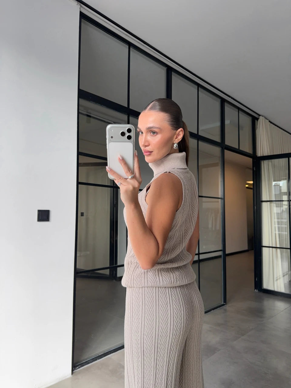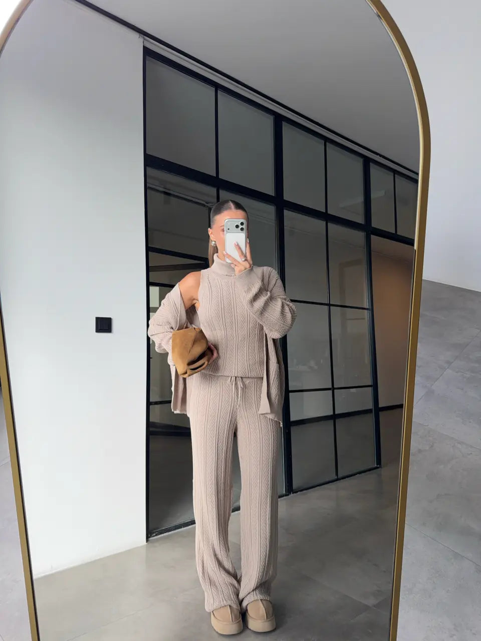 A cozy yet refined three-piece knit set designed for effortless everyday elegance.