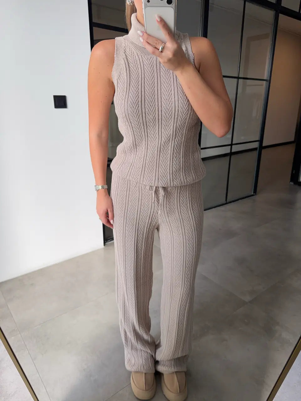 The beige Knit Three-Piece Set features a sleeveless cable-knit top, wide-leg pants, and a matching long cardigan — all crafted from a soft cotton-blend fabric that offers warmth, breathability, and comfort.