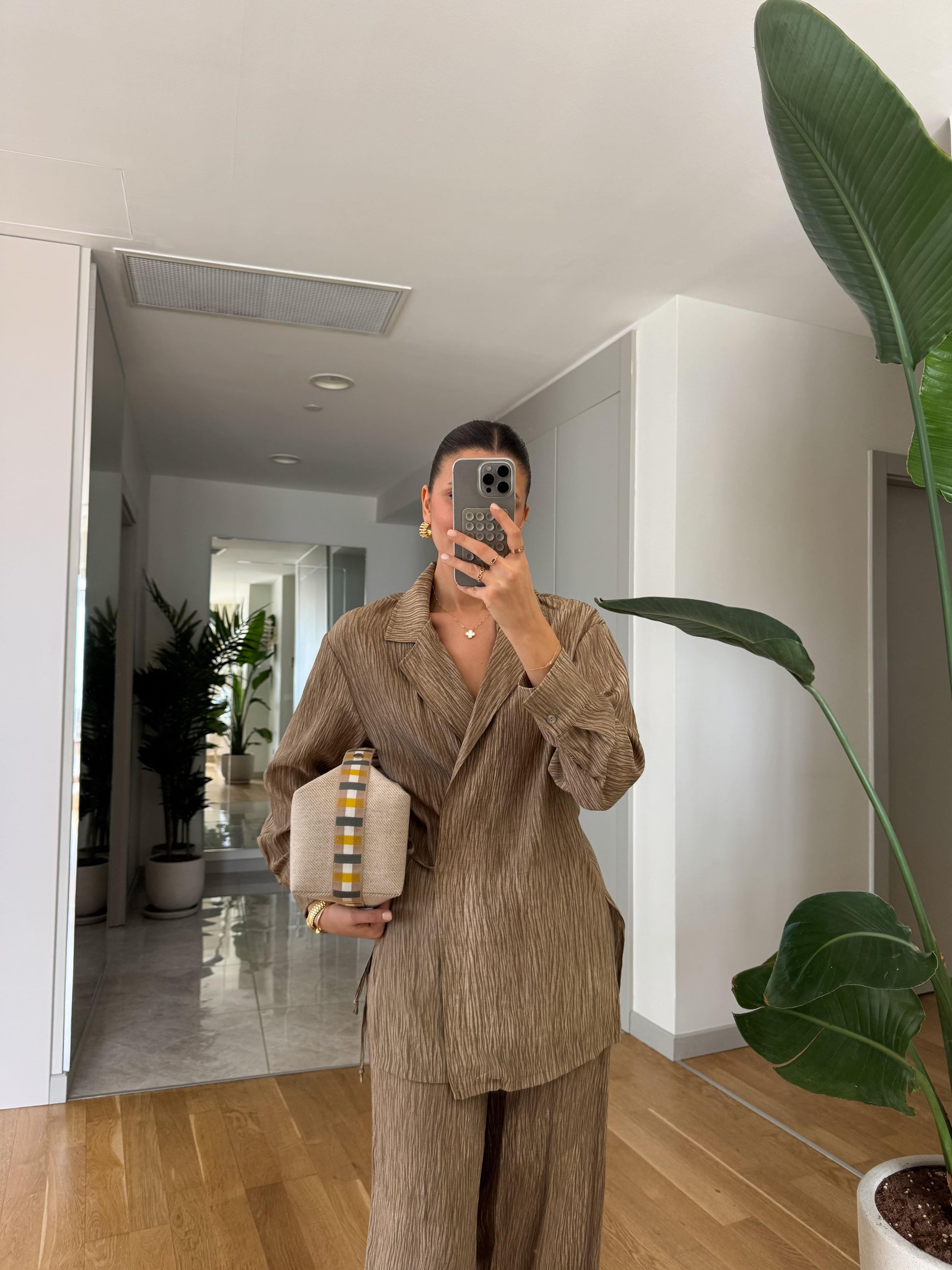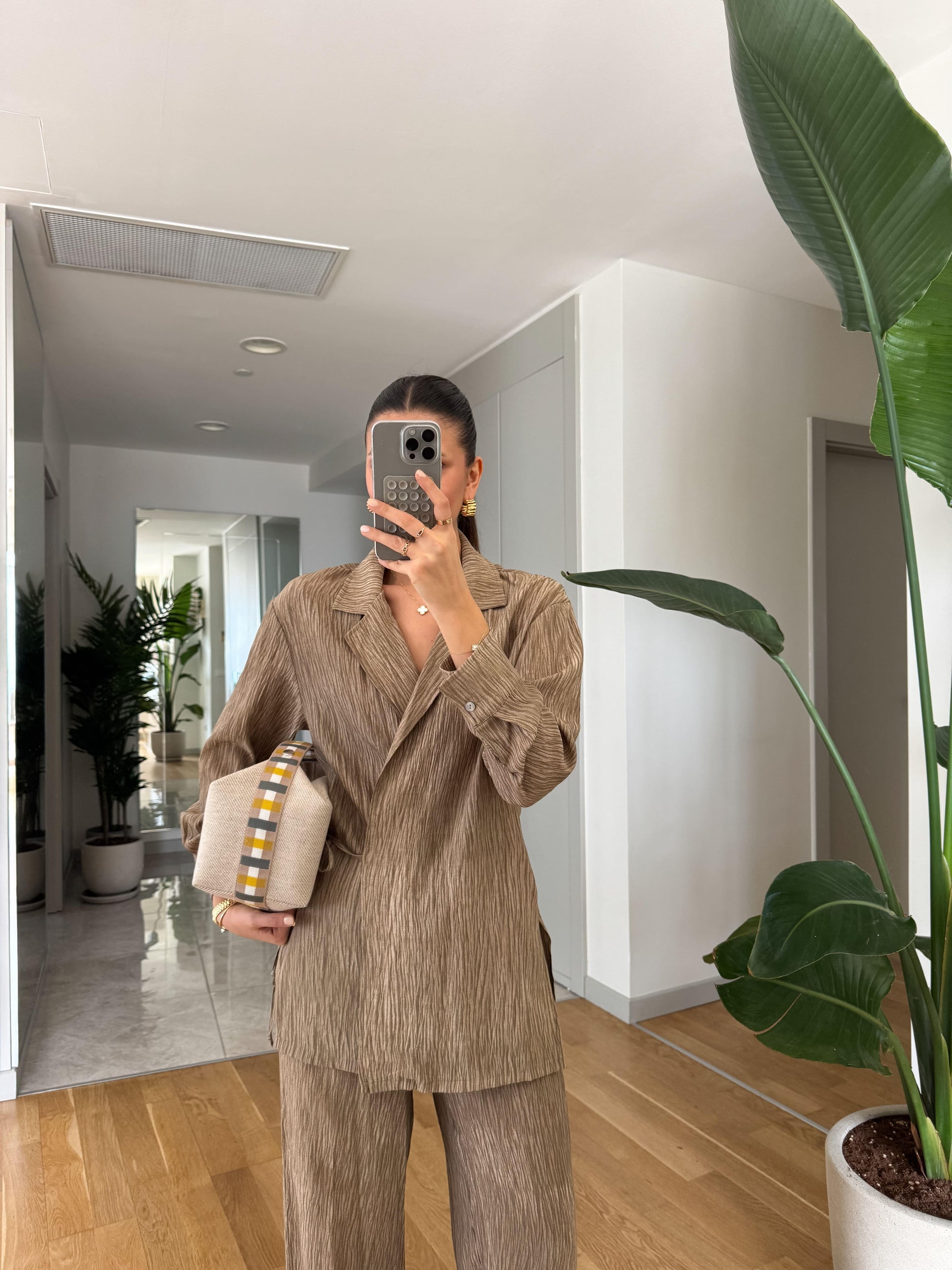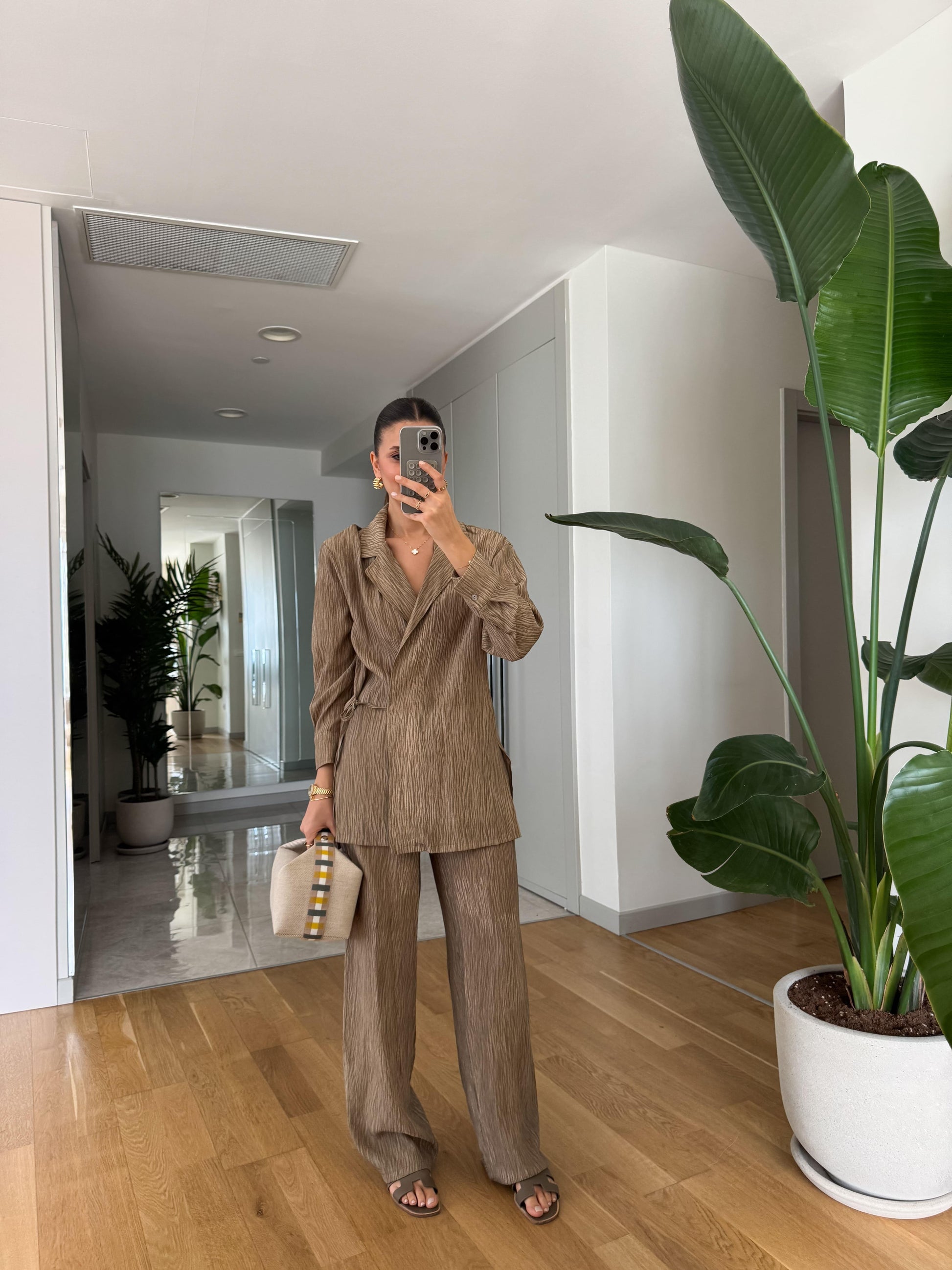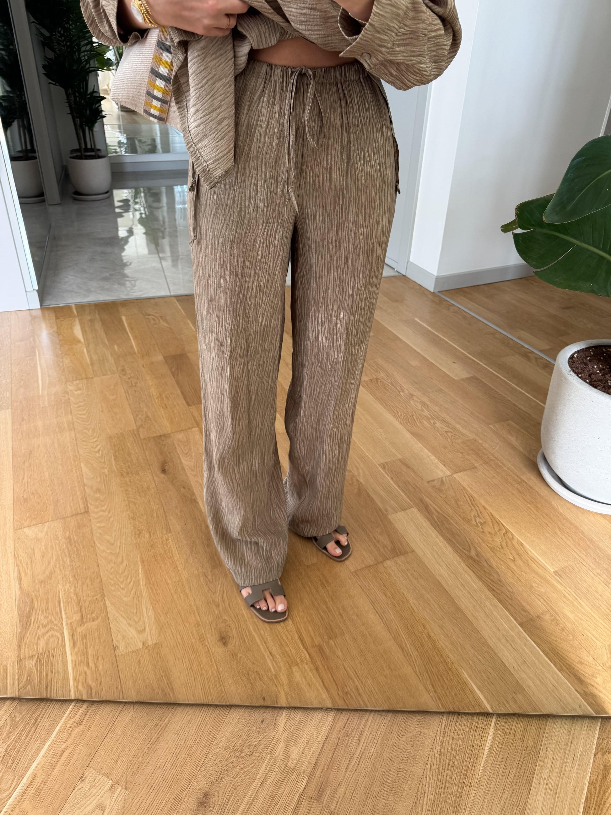 This effortlessly elegant duo features a tie-front blouse and comfortable matching pants, both in a warm café hue. Perfect for casual outings or cozy gatherings, this set combines modern charm with all-day comfort.