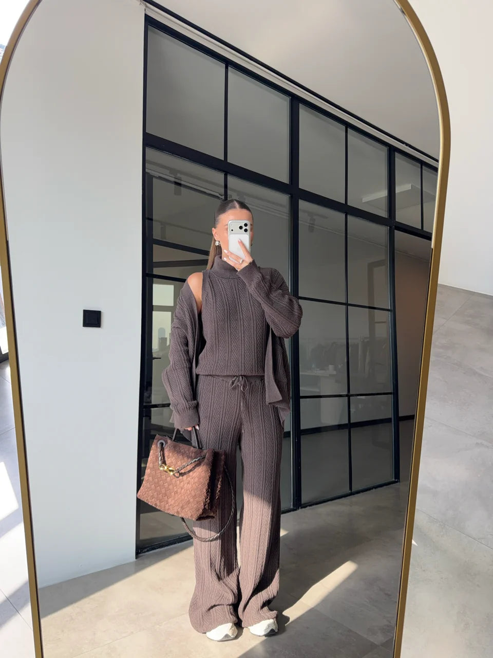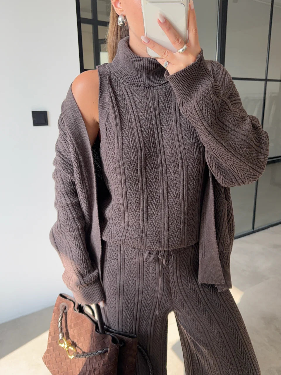 A cozy yet refined three-piece knit set designed for effortless everyday elegance.