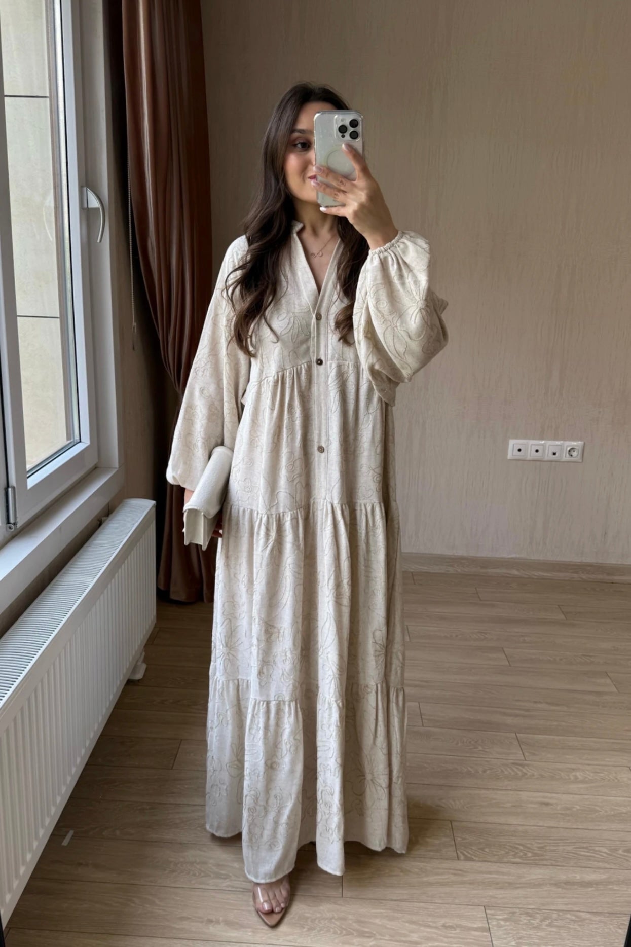 Step into elegance with the embroidered linen dress, a graceful linen piece delicately embroidered with shimmering gold thread for a subtle, radiant touch. Perfect for both special occasions and refined everyday looks, this dress combines comfort with timeless charm, style it with gold accents or a statement belt for a personal touch of glam.