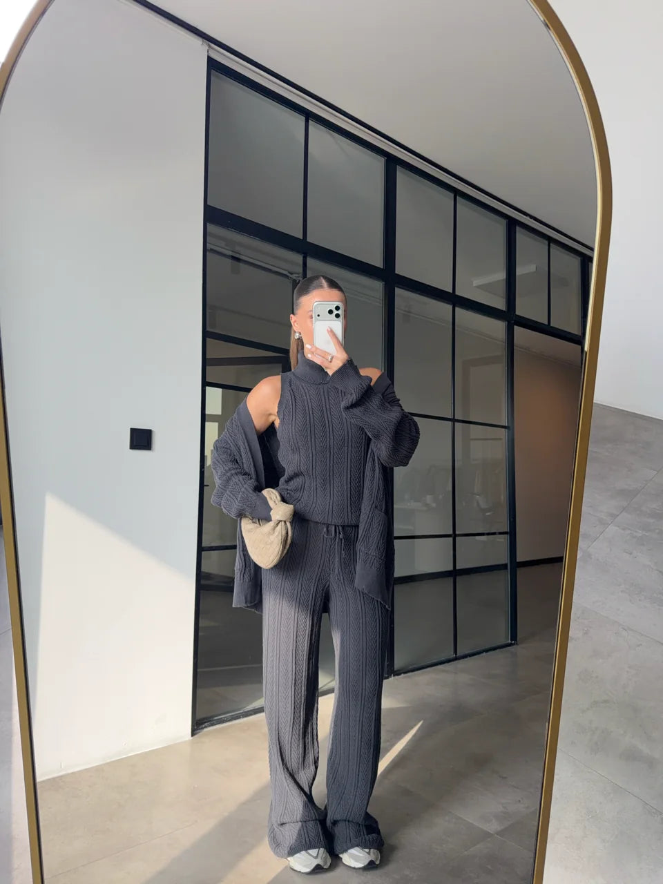 A cozy yet refined three-piece knit set designed for effortless everyday elegance.