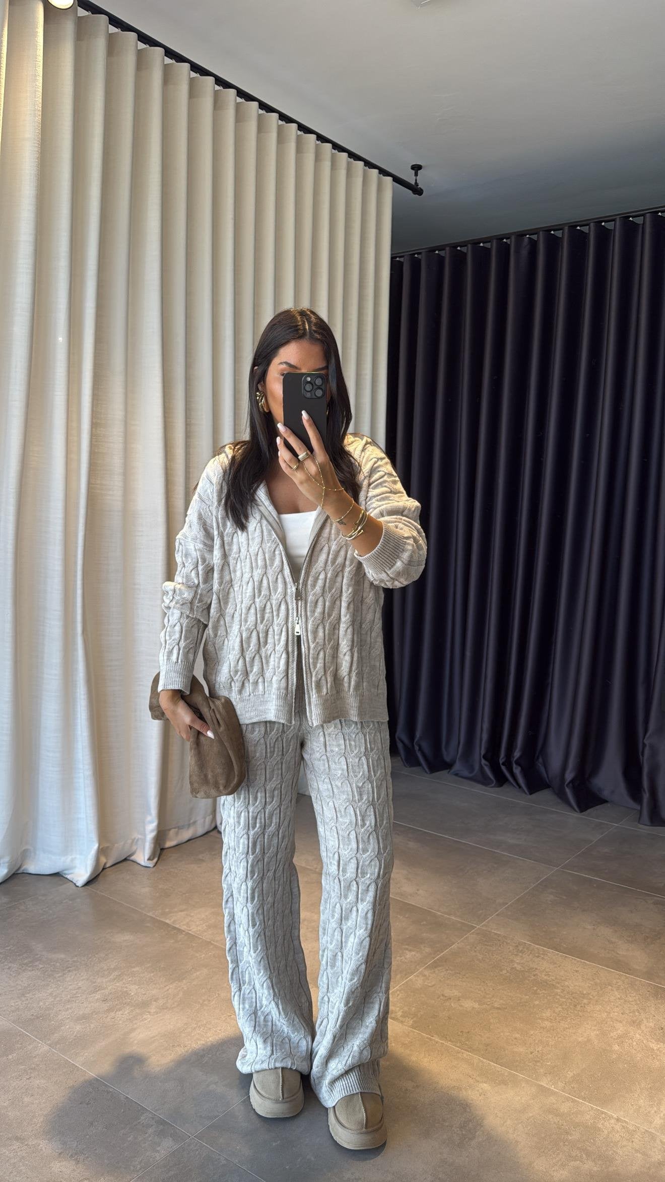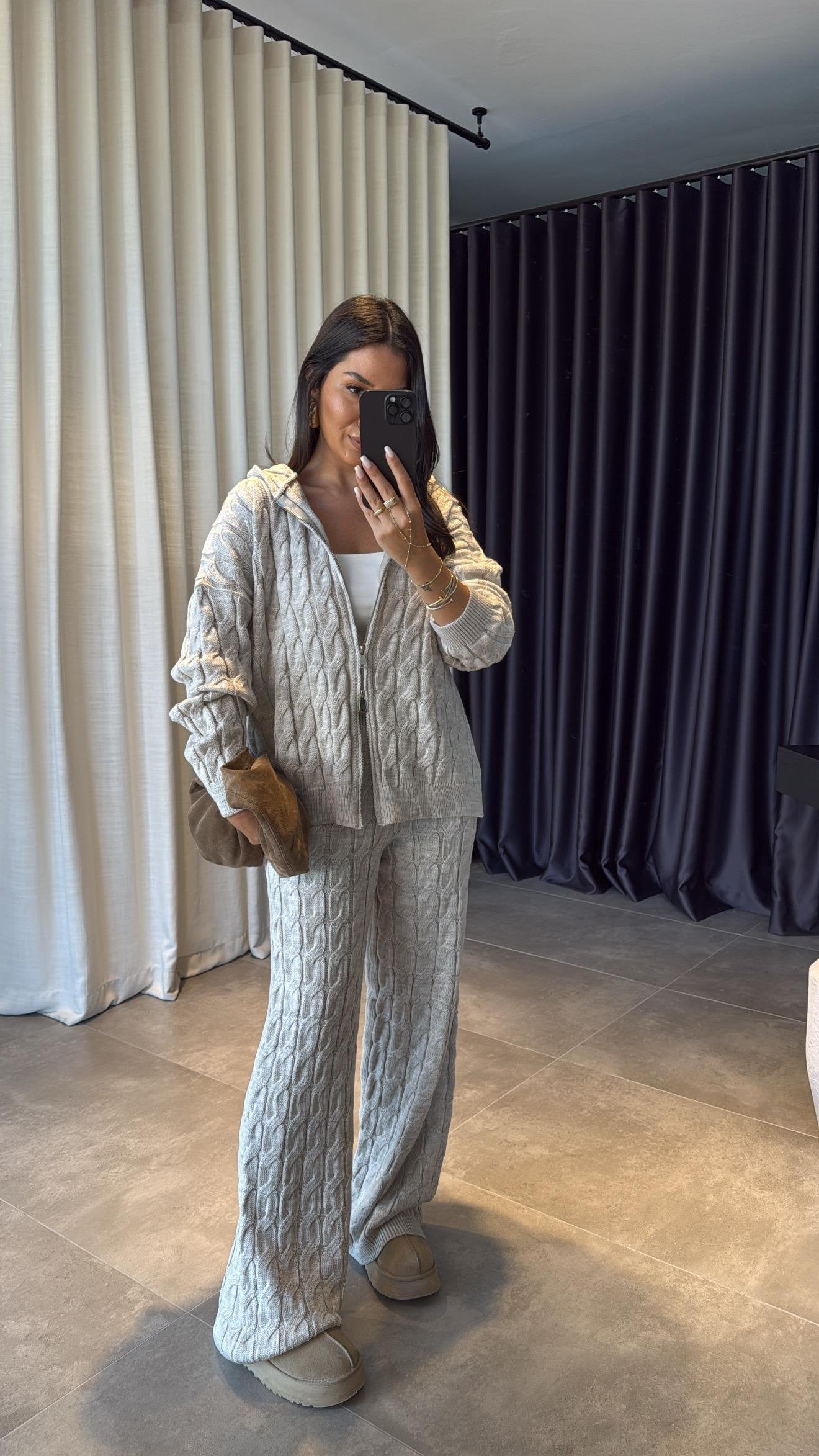 A soft, cozy cable knit set featuring a relaxed zip-up hoodie and wide-leg pants. Designed for warmth and comfort while keeping a chic, effortless silhouette. Perfect for travel days, lounging, or casual winter outings.